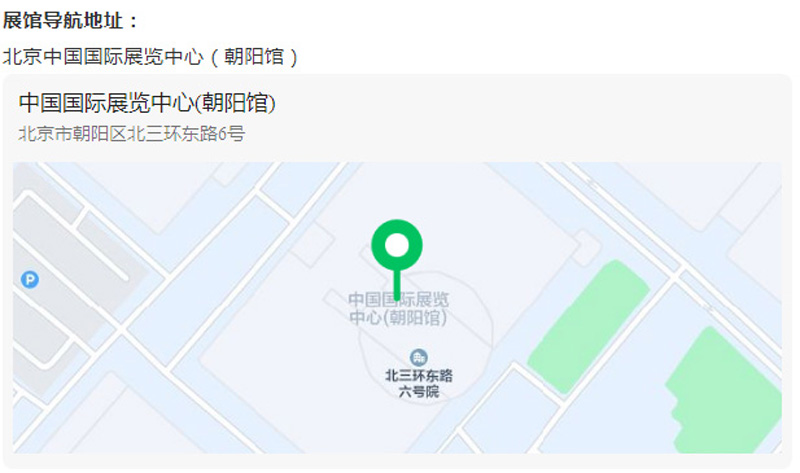 展館導(dǎo)航地址:北京中國國際展覽中心(朝陽館)
