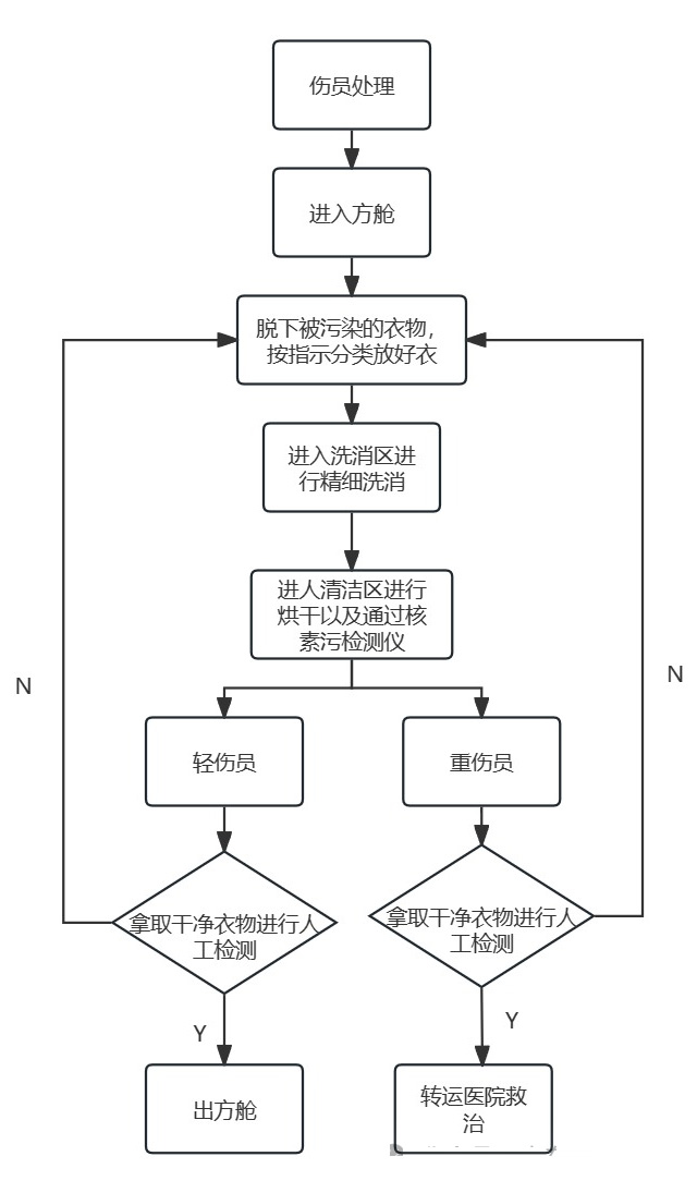 傷員處理->進(jìn)入核化污染洗消車->脫下被污染的全身衣物->按分類放好衣服物品->在洗消區(qū)進(jìn)行精細(xì)洗消->進(jìn)入清潔區(qū)進(jìn)行烘干跟核污染素檢測->(輕傷員拿干凈衣服進(jìn)行檢查->出洗消車)->(重傷人員拿干凈衣服進(jìn)行檢查->轉(zhuǎn)運到醫(yī)院救治)