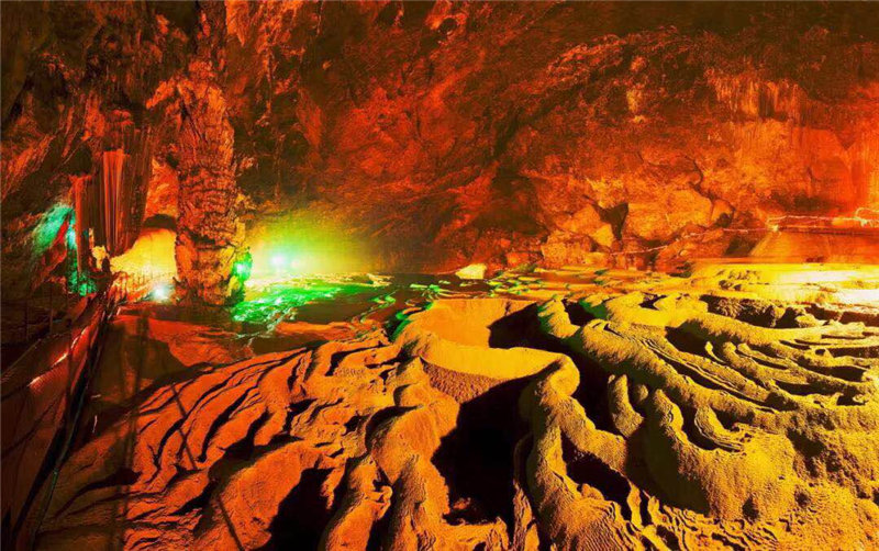 進(jìn)入黃仙洞后,只見洞內(nèi)奇石異景、百態(tài)紛呈,特別是2萬平米的邊石池、形似梯田,是黃仙洞最具特色的地方,大家被眼前的景觀深深吸引,情不自禁折服于大自然的鬼斧神工。