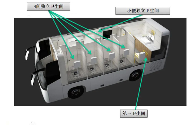 各類大型會(huì)展、賽事、文娛活動(dòng)保障往往有突發(fā)較大的如廁需求。后勤保障車整車長12米,寬2.55米,高3.6米,內(nèi)高大于等于1.9米。司機(jī)區(qū)域獨(dú)立,有兩個(gè)座位,配備獨(dú)立空調(diào)。是真空型環(huán)保廁所是用于人員大小便的專用作業(yè)車。搭載馬桶、蹲便器、洗手池等專用裝備,既相互獨(dú)立,又互相關(guān)聯(lián)??商峁?人同時(shí)入廁使用。利用真空將便器內(nèi)的污物抽吸到真空泵,經(jīng)粉碎后,再將污物輸送到污物箱,同時(shí)吸附異味,使整個(gè)廁所干凈、整潔、移動(dòng)方便。滿足多人如廁的需求,且無需外接水電,方便現(xiàn)場保潔。精準(zhǔn)到位,快速保障,有效降低了人力和時(shí)間成本,提高了使用效率。取消原車風(fēng)道,降低平地板,增加了原有使用空間,整車根據(jù)不同功能需求分區(qū)布局,充分采用新技術(shù),滿足人們對(duì)生活品質(zhì)的追求;節(jié)約資源,轉(zhuǎn)場效率高。滿足人們的如廁需求。大大節(jié)省了傳統(tǒng)廁所建設(shè)的人力、物力財(cái)力。