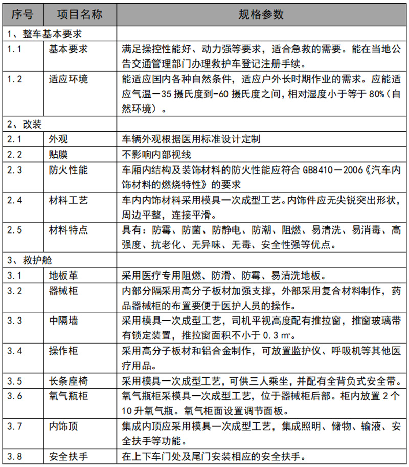 滿足操控性能好、動力強等要求,適合急救的需要。能在當(dāng)?shù)毓娼煌ü芾聿块T辦理救護車登記注冊手續(xù)??梢允褂酶鞣N自然環(huán)境使用,戶外作業(yè)也不在話下。零下35度到60度都適應(yīng),小于80%濕度環(huán)境。符合GB8410- 2006 《汽車內(nèi)飾材料的燃燒特性》的要求。內(nèi)部分隔采用高分子板材加強支撐,外部采用復(fù)合材料制作,藥品器械柜的布置要便于醫(yī)護人員的操作。采用集成電路控制系統(tǒng),觸摸屏操作,可顯示日期,時間,溫度,濕度,時時監(jiān)控電池電壓,交流電壓,消毒燈開關(guān)及消毒時間的自動控制,排風(fēng)及進風(fēng)控制,吸引器的控制,逆變器控制,照明燈控制。