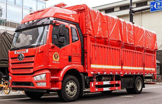物資運輸車有各種各樣的車型品牌,有東風天錦、重汽、陜汽等。6米8, 高頂雙臥,18噸總質(zhì)量,花籃車廂,解放這代中卡風格獨到,立體感很足。高頂雙臥駕駛室,適合多位駕駛員輪班。如果遇到跨地區(qū)長距離增援,這輛車可以兩個駕駛員輪班,屬于先天性的優(yōu)勢了。260馬力的大柴CA6DK1-26E6國六發(fā)動機,排量7.2升,260馬力,1000N.m的扭矩,各方面表現(xiàn)都非常優(yōu)秀。物資運輸車匹配的應該是解放的8擋手動變速箱。前橋采用了解放最新的F4N-1900中卡橋,載重量5.5噸級別,后橋則是解放的378橋,速比有多種可選,前后橋均采用了十孔螺栓結構,并且搭配了275/80R22.5的輪胎,整車也采用了板簧懸架。左側車架甚至連經(jīng)典的器材箱都完好保留,除此之外,鋁合金氣瓶、解放的氣驅(qū)尿素和空濾看得一清二楚。油箱位于車架右側,鋁合金油箱容積400升。物資運輸車整車基本沒有針對消防做特殊化改裝,除欄板高度較高。物資運輸車食品、器材等基本上絕大部分物資的運輸,既可以尾開門卸貨,也可以側開門卸貨。